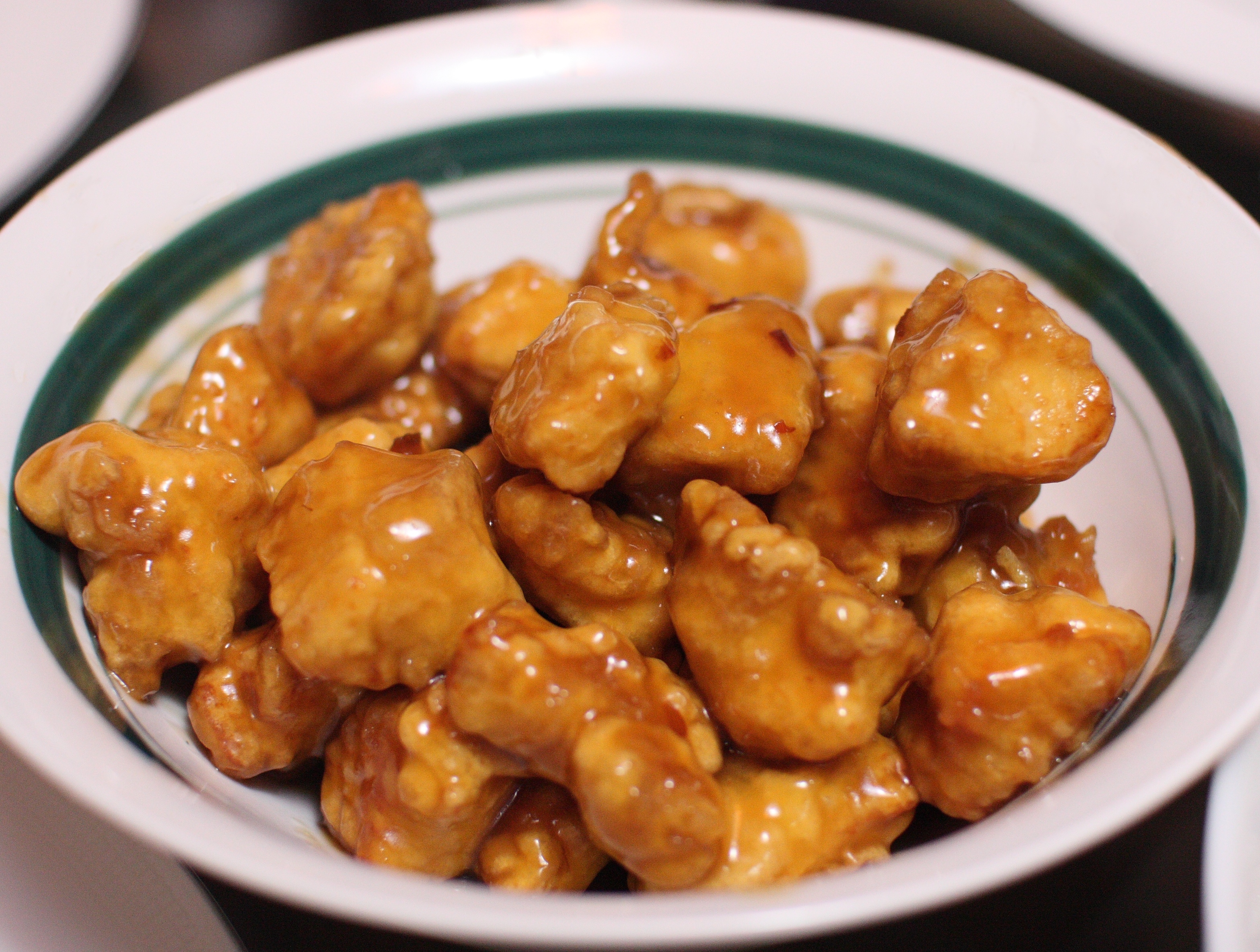 Ingredients:To make the chicken pieces, beat the eggs and corn starch together, then add small morsels of chicken and mix to cover. Drop each chicken piece into a deep fryer at 375° F, and let the batch fry for about a minute once full. Remove the deep fryer basket, invert, and use a metal spatula to scrape the pieces off the basket if stuck. Repeat until all chicken has been fried, then put all pieces into the basket and fry a minute or two more. (For best results, do this final frying step after preparing the glaze.)